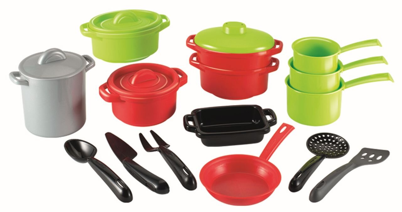 Das Kochgeschirr-Set umfasst Töpfe mit Deckel, Kochtöpfe, eine Auflaufform, eine Bratpfanne und Küchenutensilien.