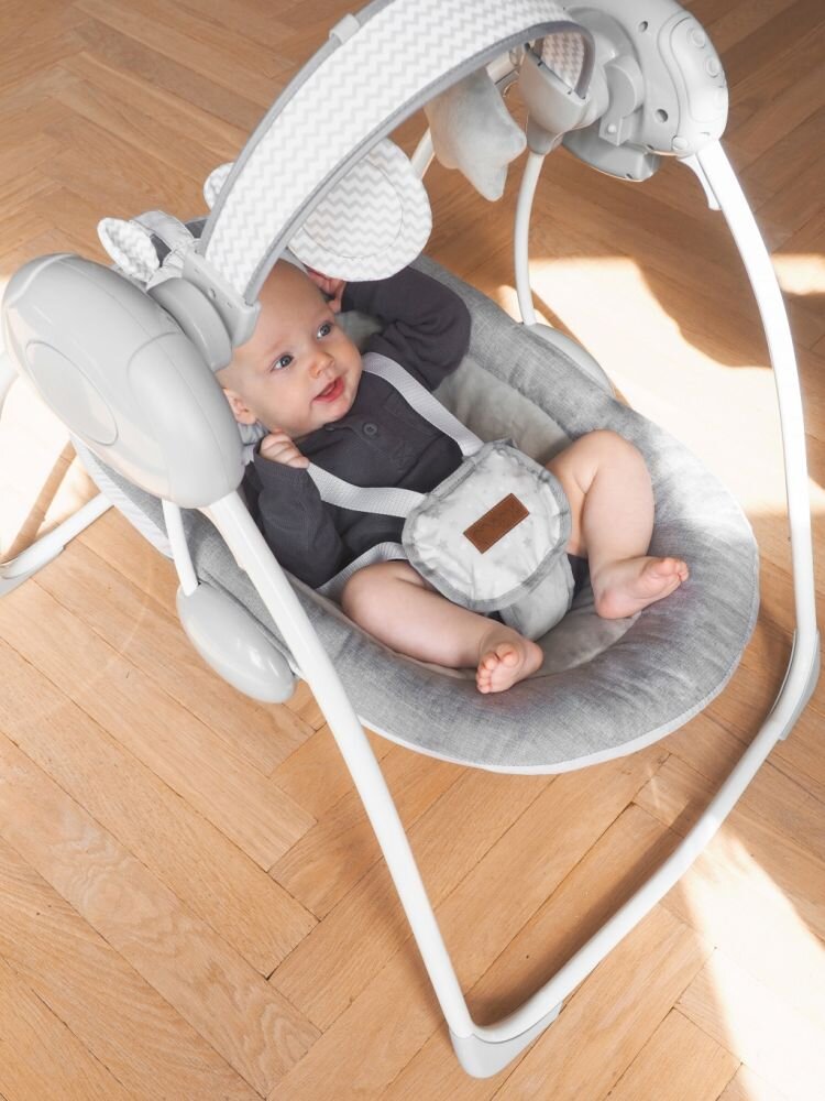 MoMi LISS ist eine Schaukel mit automatischer Schaukelfunktion, 8 Melodien und zwei Spielzeugen in Reichweite des Kleinkindes.