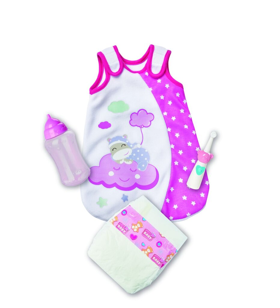 Das Schlafset beinhaltet einen Schlafsack, eine Zahnbürste, eine Windel und eine Flasche für 30–38 cm große Puppen.