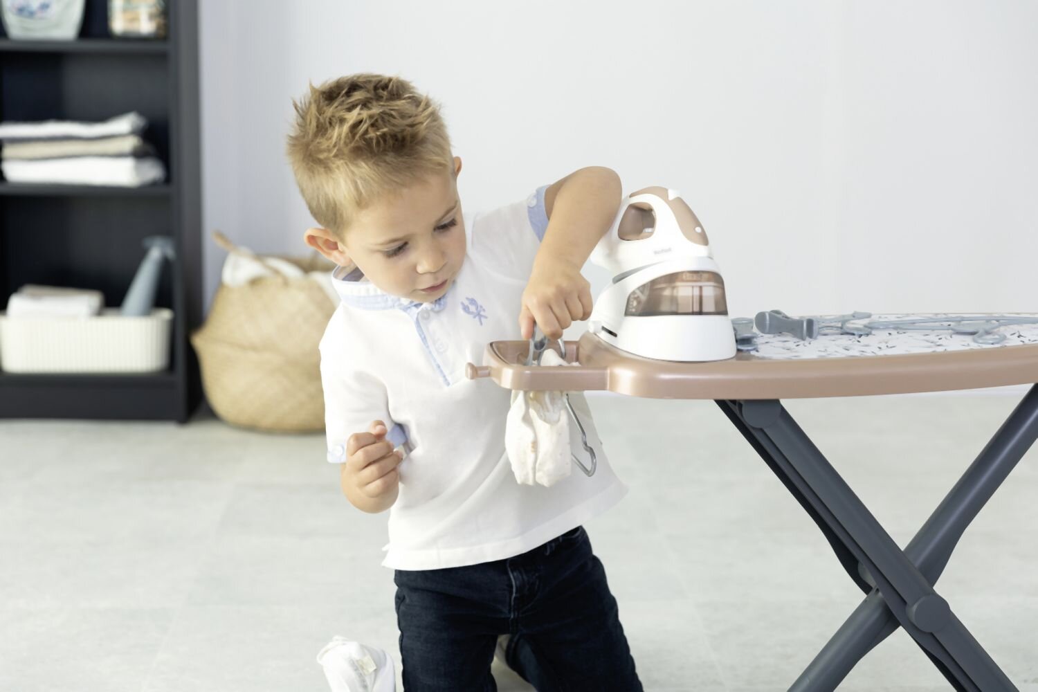 Realistisches Bügelbrett mit Tefal-Dampfstation, inklusive Bügeleisen mit mechanischem Drehknopf mit „Knack-Knack“-Geräusch.